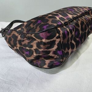 This Coach bag has bold purple, brown, and black leopard print with silver hardware. This medium-sized bag bag from 2012 is in nice preloved condition but is missing the signature coach hang tag and the crossbody strap. The leather handle does have some slight cracking, but overall in really nice condition as can be seen in the pictures. The interior is fully lined, featuring one zip pocket and two slide-in pockets. Please ask any questions you think you may have to ensure a confident purchase.