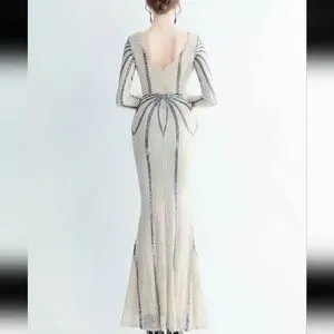 This stunning gown features a backless design adorned with intricate embellishments, creating a captivating shimmer. The long bishop sleeves and plunging neckline add a touch of elegance, making it perfect for a bride or a wedding guest. The gown's graceful silhouette and exquisite detailing ensure you make a memorable entrance at any cocktail event.