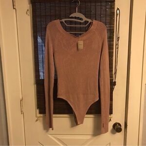 So sleek and versatile, this ultra-soft bodysuit is featured in a textured fabrication and long-sleeve silhouette with a wide neckline and floral detail throughout. Size M Pit to Pit is 16 inches