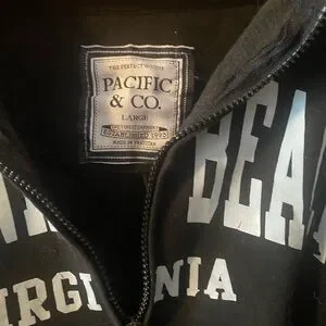 Black and white Virginia Beach hoodie, oversized large. Has a little pealing #skater pacific & co. Stay comfortable and stylish with this black hoodie featuring a bold Virginia Beach print. Perfect for casual outings and cozy days. Unisex L
