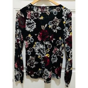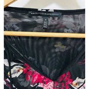 White House Black Market Floral Mesh Ruffle V-Neck Blouse Black Small