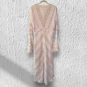 Charming blush maxi dress. Features ruffle sleeves and delicate patterns. Ideal for elegant events.