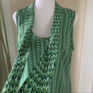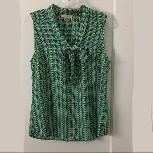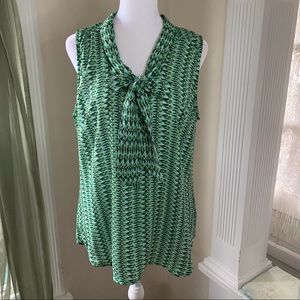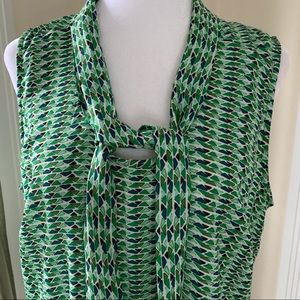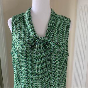 Roz & Ali sleeveless blouse with neck bow tie / sash. Pretty vibrant green geometric pattern. Pleated back.