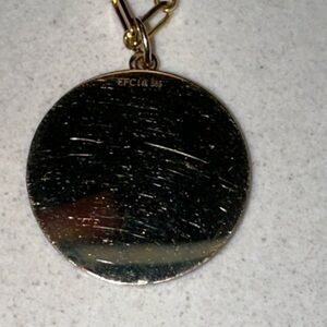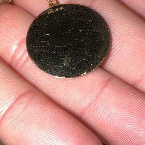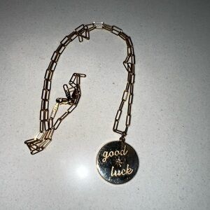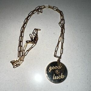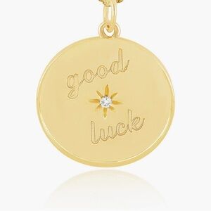 This beautiful 14K yellow gold pendant necklace features a jumbo pendant measuring 20mm in height with an 18" Mini Lola chain. The pendant features "good luck' engraved on the front with a 0.03ct diamond in the center. Diamonds are SI1-SI2 in clarity with G-H color.