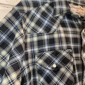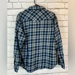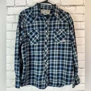Wrangler Wrancher Vintage Blue Plaid Flannel Shirt w/ Pearl Snap Buttons size XL