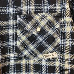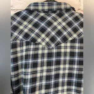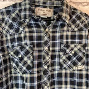 EUC Wrangler Wrancher Vintage Blue Plaid Flannel Shirt w/ Pearl Snap Buttons size XL. This is a true flannel weight shirt with blue, black, and gray. Features white pearl snap buttons. Western details at the shoulder and back. Perfect vintage item. Does run a bit small so check your measurements!