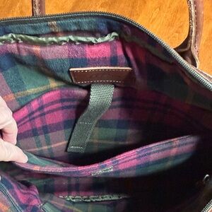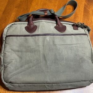 Stylish and functional canvas briefcase. Features dual front magnet pockets and leather handles. Ideal for daily essentials. See pictures for worn use. Good condition. It could use a good scrub. Inside of bag is great