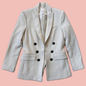 Keywords: Veronica Beard blazer, made in USA blazer, designer blazer, double breasted blazer, tailored jacket, neutral blazer