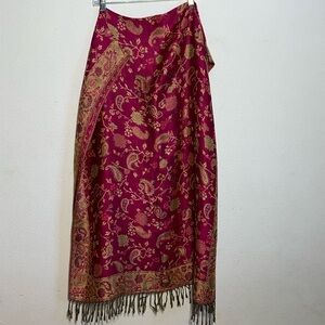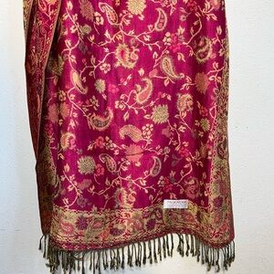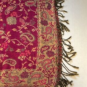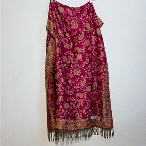 In excellent condition, beautiful floral patterned shawl with fringe detailing. Rich pink and gold tones, perfect to use for a night out, dinner or church! Who is going to love this and take it home!