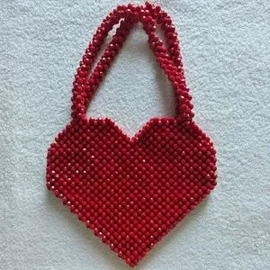Red woven beaded heart small tote. Snap interior closure. 8.25"H x 9.25"L x 0.75"D.