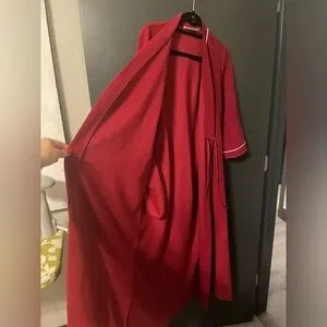 This robe is in excellent condition for its age. She’s all washed and smelling fresh and ready for coffee with you. The fit is very close to the body and not at all bulky like most robes today. The sleeves are 3/4 length and do have a bit of damage noted in photos that appear to be from an iron or stove flame. Other than that she’s regal and gorgeous. Sizing is P. I am a true 4 and it fits me perfectly. I’d say up to a 6 would be comfortable.