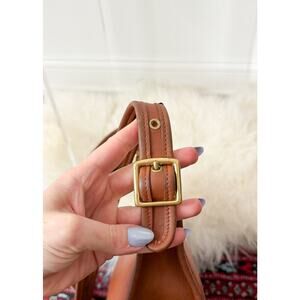 Beautiful British Tan glovetanned leather Janice purse features brass hardware, adjustable shoulder strap (comes with an unoriginal heavy gold chain, too!), zipped top and interior pocket.