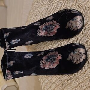 Chic black ankle boots with floral design. Velvet texture. Side zipper for easy wear. 2.5 inches heels. Very comfy and soft.