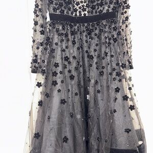 Elegant tea-length cocktail dress with a semi-sheer illusion yoke and sleeves, tulle overlay skirt, and intricate velvet floral accents and beading throughout. A tonal velvet band accents the natural waist, and the skirt is finished with a velvet-trimmed bottom hem.