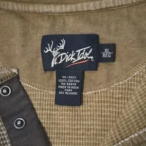 The Dick Idol Waffle Knit Henley Shirt in Men's XL is a stylish and versatile addition to any wardrobe. Made from cotton in a waffle-knit style, this long sleeve Thermal shirt features a snap buttons crew neck neckline for added comfort and style. The solid brown color makes it perfect for casual, travel, or workwear occasions, with accents like embroidered logos and a heavyweight, thermal feel that is ideal for colder seasons like winter, fall, or spring. Perfect for men looking for a classic and durable sweater with a unique touch.