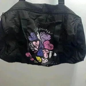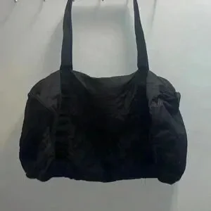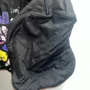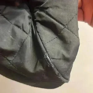 This bag is quilted fabric with a purple interior. She has some scuff marks and small holes on the sides and front. It’s zipped with an open pocket where the logo is located. This bag remains usable and lightweight.