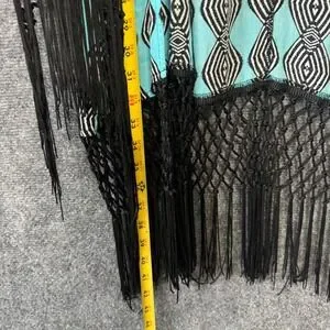Democracy Kimono Cardigan Women XL Turquoise Black Diamond Pattern Fringe Boho
