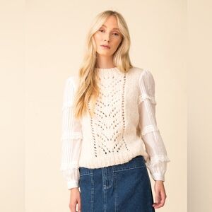 The Emma eyelet combo sweater features balloon sleeves with ruffle and pleated detailing.