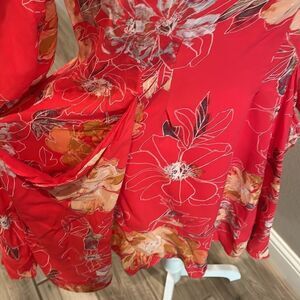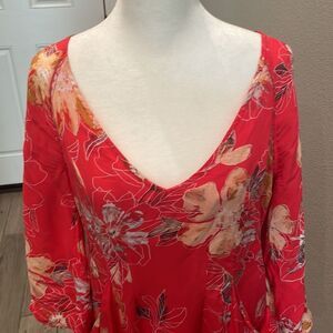 Vibrant red mini dress. Features floral pattern. V-neckline and long sleeves. Perfect for casual outings.