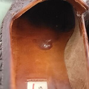 Wooden Stacked Heel has a slight chip, see photo.