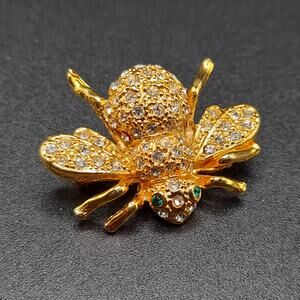 *Description: This is a beautiful small vintage bee brooch with clear pave' rhinestones on a gold tone insect bee brooch. The bee has two green rhinestone eyes. All six legs are in view. This would be a great addition to your jewelry collection or make a great gift!