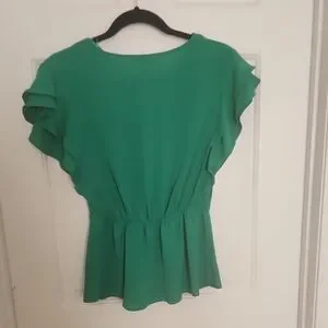 Green wrap top features a flattering V-neck and ruffled sleeves, has elastic back.