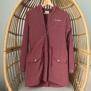 Flattering Columbia long softshell jacket in a rich burgundy color. Lightweight with stretch, adjustable waist, and hood—perfect for everyday wear, travel, or outdoor walks.