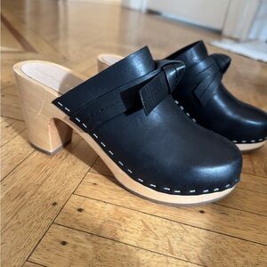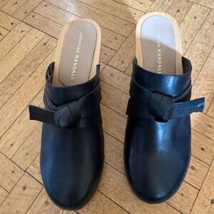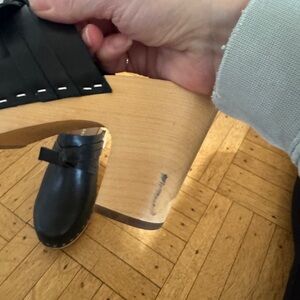 Elegant black leather mules with a stylish bow accent. Features a sturdy tan wooden heel. Ideal for versatile wear.