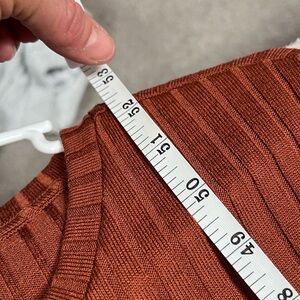 The Old Navy Women's Size Large Tall Copper Knit Dress is a versatile and stylish option for various occasions. Made from a blend of polyester, spandex, and rayon, this long sleeve dress features a pullover closure and a crew neck neckline. The Midi, pencil dress style offers a flattering fit with a solid color and rib knit fabric type, perfect for winter, fall, and spring seasons. Machine washable and featuring a lightweight and stretchy material, this dress is a great choice for those looking for a comfortable and fashionable option. Measurements in photos. Measurements are approximate