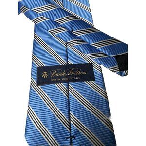 This product is a classic Brooks Brothers blue silk tie featuring black and white diagonal stripes, designed in a traditional striped pattern. The tie is one size and is made of high-quality silk, with a classic length of 57"-60" and a classic width. It is accented with the Brooks Brothers logo and is perfect for men looking for a designer accessory with an American, preppy style. This tie is a timeless piece that adds a touch of sophistication to any outfit.