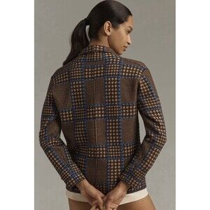Stylish plaid blazer. Features brown and blue check pattern. Single button closure. Perfect for layering.