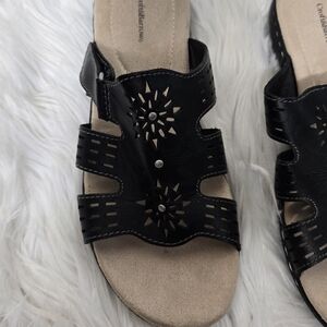 Stylish brown sandals with cutout pattern. Comfortable slip-on design. Perfect for everyday wear.