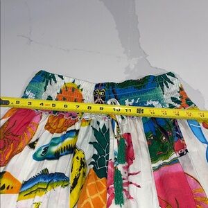 True Destinations Beachy Boho Vacation Pants in size Large, perfect for a flowy tropical look. These wide-leg Capri pants feature a beachy pattern, pull-on closure with a drawstring, and an elastic waist for comfort. Made from lightweight rayon material, these multicolor pants are designed for women who love a tropical theme and want to feel stylish and comfortable on their vacations. The brand Final Destination ensures a quality and fashionable addition to your summer wardrobe.