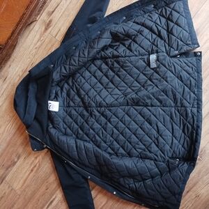 Black parka! Features button and zipper closure, arm pocket, high neck and removable hood.