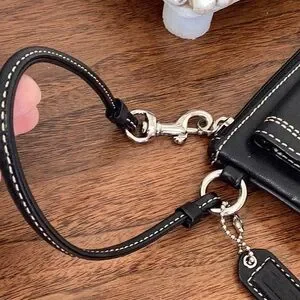 Stylish black wristlet with silver accents. Features a buckle detail and wrist strap.