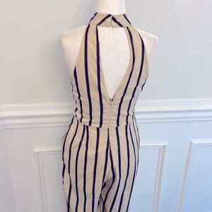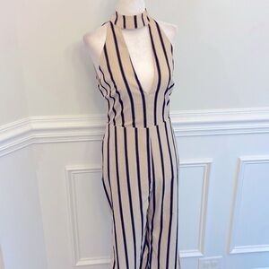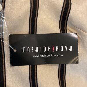Fashion Nova Jumpsuit. Taupe color with black and brown stripes. V neck. Zips on back and has two buttons on back of neck. Pockets on side. Pants have high side slits that go up past knees. Pit to pit is approximately 16 inches. New with tag and spare button.