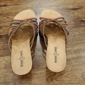 NEW WITHOUT TAGS These womens Minnetonka leather multi color slip on sandals are a size 9. The soles are suede. Only tried on, never worn. The shoe measures 10.5 inches across the bottom and they have a small 2 inch heel.