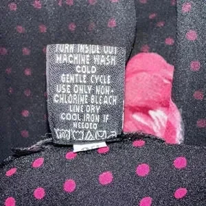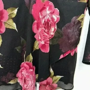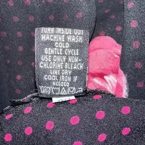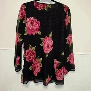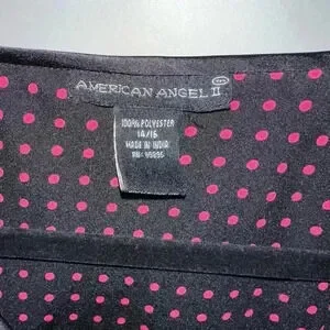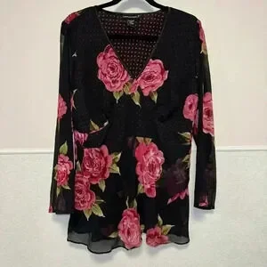 Pre-owned American Angel II women's blouse, size 14/16, made in India. The black sheer top features a pink polka dot underlayer visible at the V-neck and cuffs. The overlay showcases a pink and green rose print. It's made of 100% polyester. The blouse has long sleeves and a slightly A-line silhouette. Measurements are not provided. The condition is pre-owned, showing no significant flaws or damage visible in the provided images.