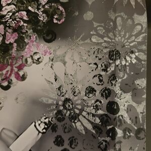 This captivating painting features a black and white portrait surrounded by a lush arrangement of pink flowers that cascade elegantly. The vibrant pink, blue, white, black, & Purple hues create a striking contrast with the muted tones of the portrait, enhancing the ethereal quality of the artwork. The dark frame further highlights the vivid colors, making it a stunning addition to any art collection.