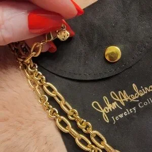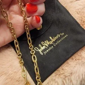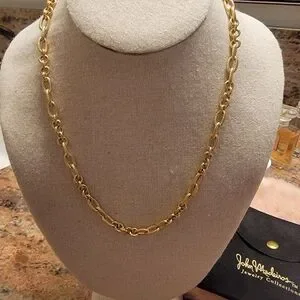 Elegant gold chain necklace from JM. In perfect condition. Worn once. I have a few like it and I am just not ever reaching for it. Can be worn alone, or with other layering pieces. You can also wear it as a choker- bc the clasp will hook to any part of the chain. A bonus! This chain will also hold charms/pendants. JM pieces last forever. I have several. Will ship in its own little velvety JM bag.