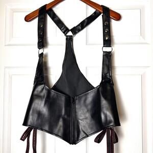 Turn heads and break rules in this black faux leather harness-style crop top. Designed with an edgy halter silhouette, adjustable snap straps, and a sleek front zip closure, this piece brings serious biker / club / alt energy. The structured faux leather bodice cinches the waist with black/red holographic ribbon, while the open back and harness detailing give it that unmistakable badass, confidence-forward vibe.