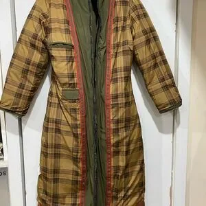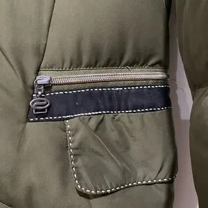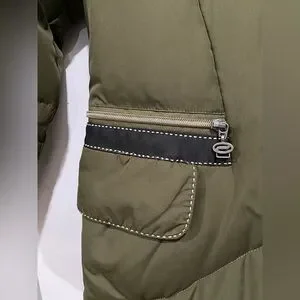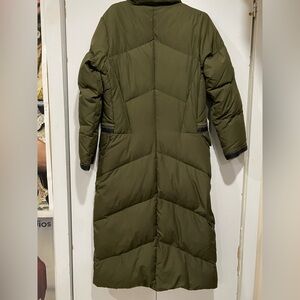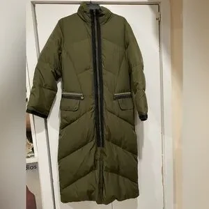 Preowned and in good condition Sportalm long maxi coat in size EU 38 and color olive green. Outer shell and inner lining materials ink unit cost is radiation protected. It has 2 lower pockets and 2 inside pockets and long sleeves.