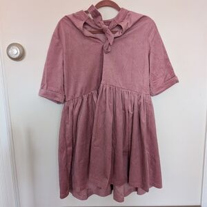 Step out in style with this elegant mauve ribbed mini dress. Perfect for any occasion, it combines comfort and fashion effortlessly. Two front pockets and a tied back closure.