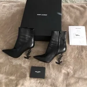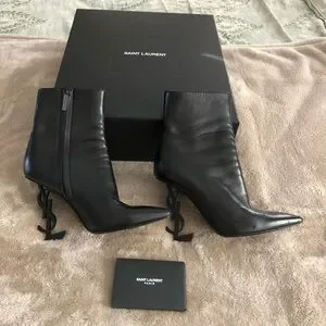 Sophisticated black heeled boots by Saint Laurent. Features iconic logo heel design. Perfect for a stylish statement while elevating any outfit! Please zoom in on last photo to see slight wear on leather…not noticeable when wearing. From a smoke free home. Serious buyers only…no low ball offers.