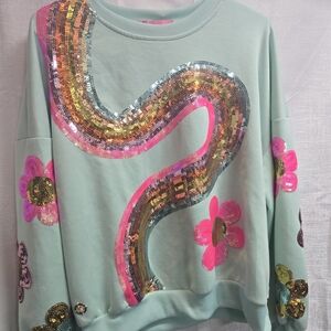 Chic top with vibrant pink and gold sequin flower. Perfect for casual outings. One tiny imperfection on the back of the top (pictured), otherwise this is in brand new condition.