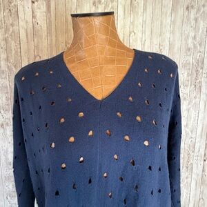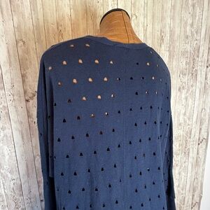 Size small J. Society New York dark blue v-neck sweater with punch-hole eyelet design. 100% cotton. Roomy, oversized fit through the bodice with dolman sleeves. Ribbed cuffs and side slits.