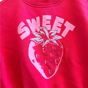 Bright red sweatshirt with a fun strawberry graphic and 'Sweet' text. Ideal for a cheerful look.