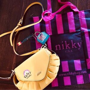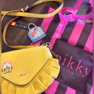 Bright and cheerful NIKKY USA crossbody purse in a sunny yellow shade. This brand-new, never-used bag features a playful “Happy Rainbow” graphic paired with a structured silhouette and soft pleated detailing for a boutique-inspired look.