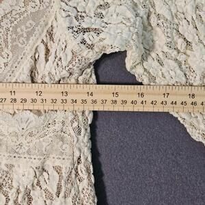 In very gently worn condition Cabi cream color lace 3/4 sleeve top with nude inset. Deep V neck No holes or tears Nude inset is on body only and not on sleeves Size medium Pit to pit 14, length 21.5 See Photos