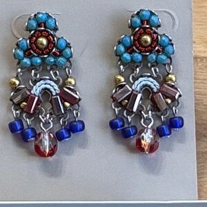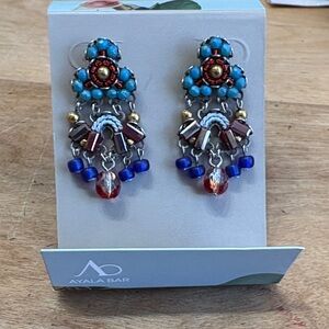 Iconic designer Ayalabar beautiful blue, red, gold, and silver mosaic and beaded earrings there’s a brand new never worn in perfect condition. There are about 1 1/2 inches long 5/8 of an inch wide. They are just spectacular. You can wear them with a T-shirt or even black tie.